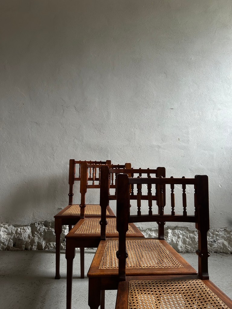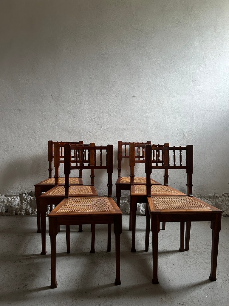 Set of six chairs in mahogany stained beech and cane.