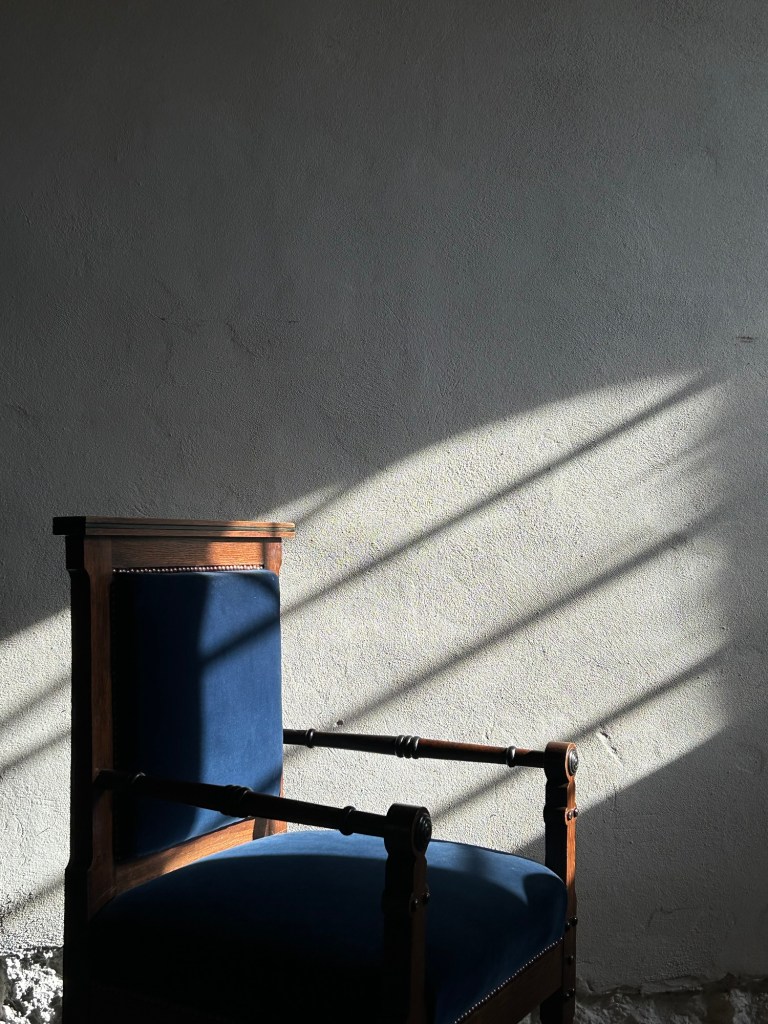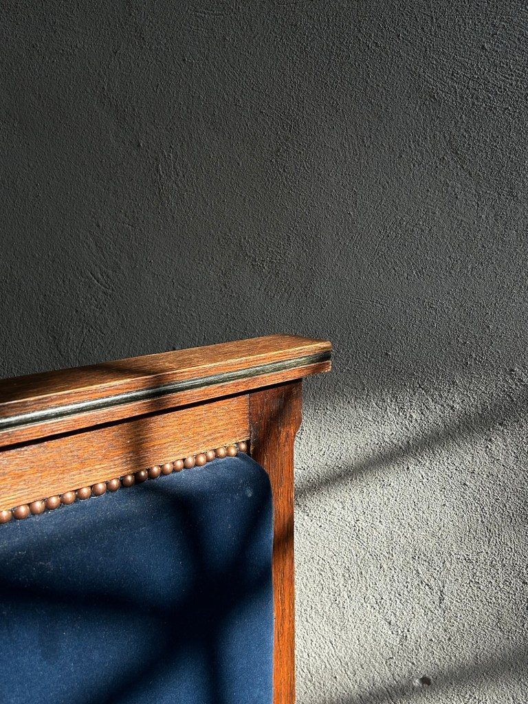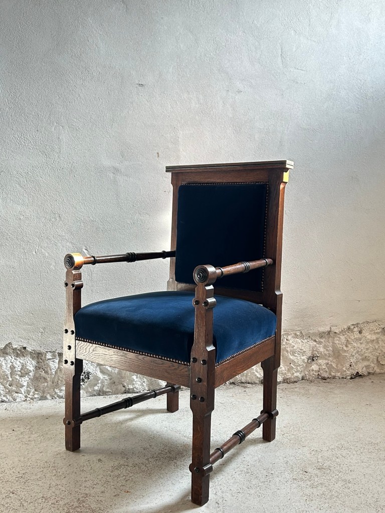 Armchair in oak and ebonized wood with fabric.