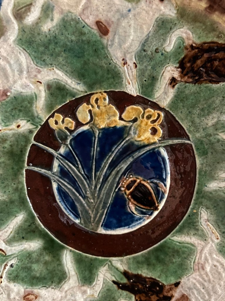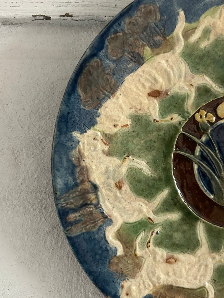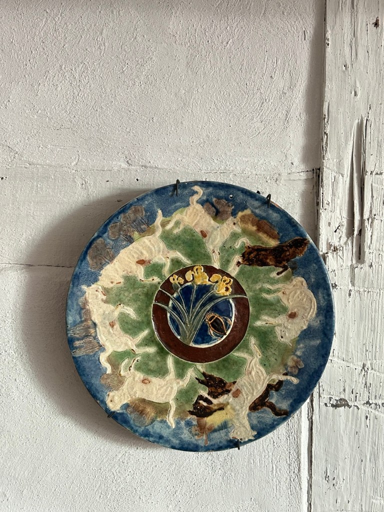 Ceramic dish incised with animal and plant motifs in relief.