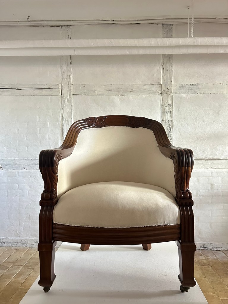 Lounge chair in solid mahogany and fabric.